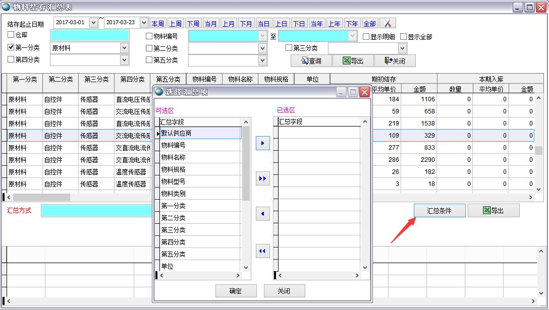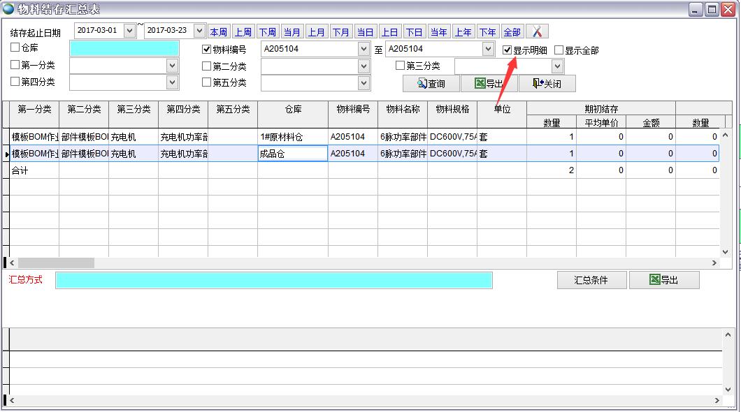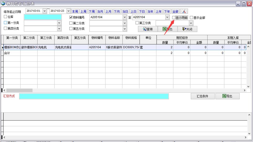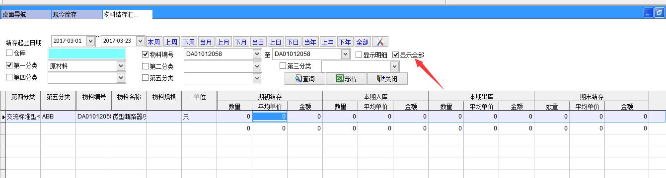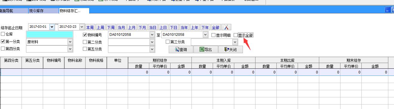 打開路徑:【主菜單】->【倉庫】-> 【報表】->【物料結(jié)存匯總表】