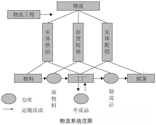 物流系統龐大且復雜,主要包括采購、物料存貨、保管、包裝、配送、運輸、區域選擇、物流信息等要素。其涉及的范圍包括以下四個方面(如下圖所示)。