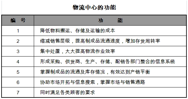 物流中心,或者稱作配送中心、配銷中心,是指在制成品的實體配銷過程中扮演集中分配功能的部門。其具有七大功能,如下表所示。