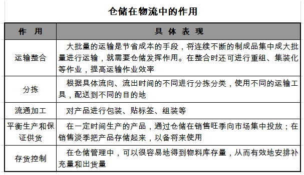 可見,物流中心是作為倉庫和實體配銷的角色存在的。下表說明了倉儲在現代物流中的作用。