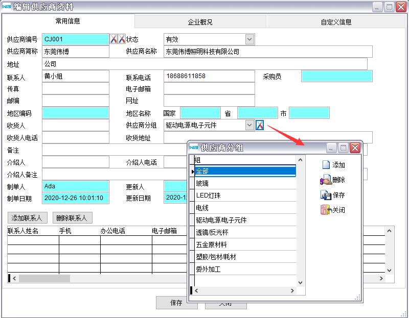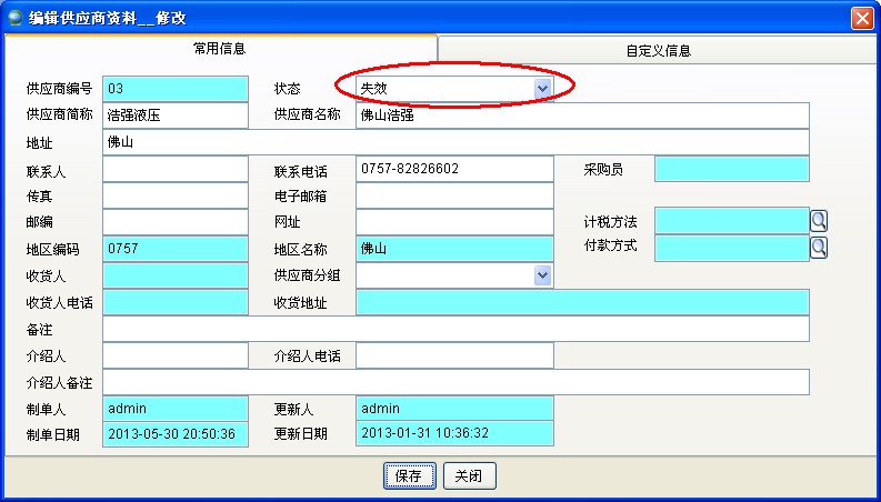 雙擊表格中的行可以進入供應商資料詳細信息。供應商編號是無法修改的,如果該編號不再使用可以刪除或失效?蛻艟幪枴⒐⿷叹幪、部門編號是共用一套編碼規則的,也就是說如果已有客戶編號0001,則供應商編號、部門編號不能再使用0001這個編號。