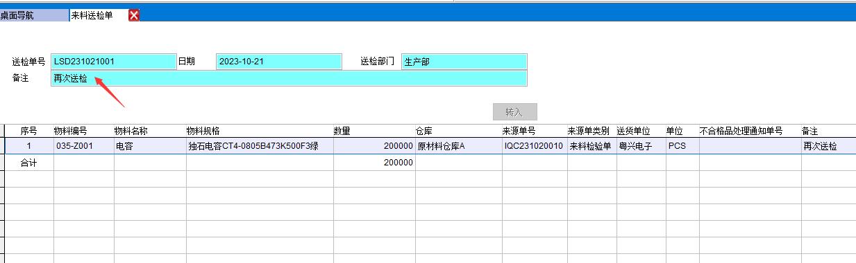 打開路徑:【主菜單】->【質量】-> 【來料送檢單】 -> 【來料檢驗單】