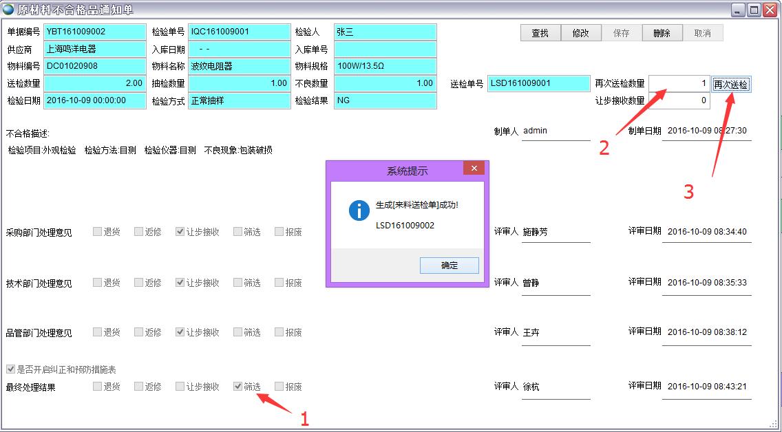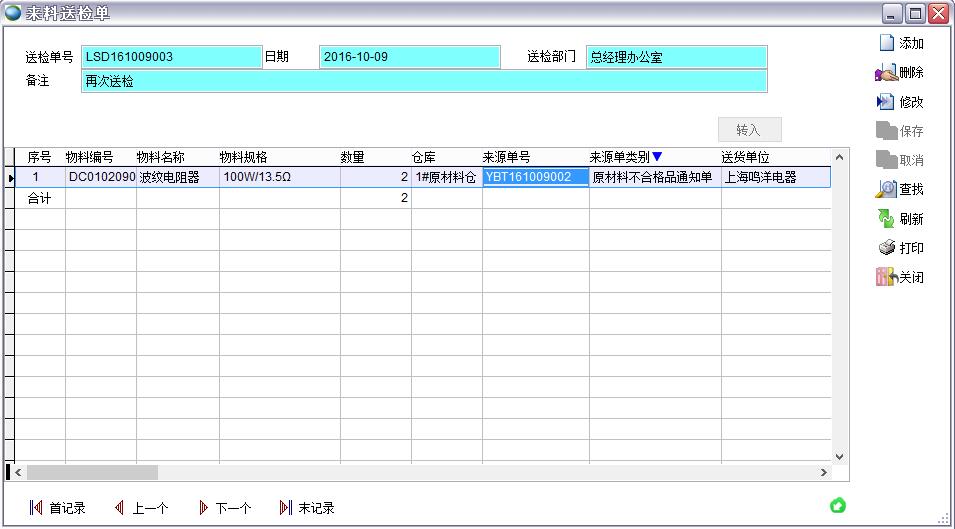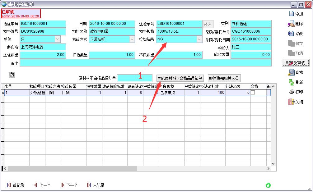 打開路徑:主菜單->質量->來料送檢單->原材料不合格品通知單