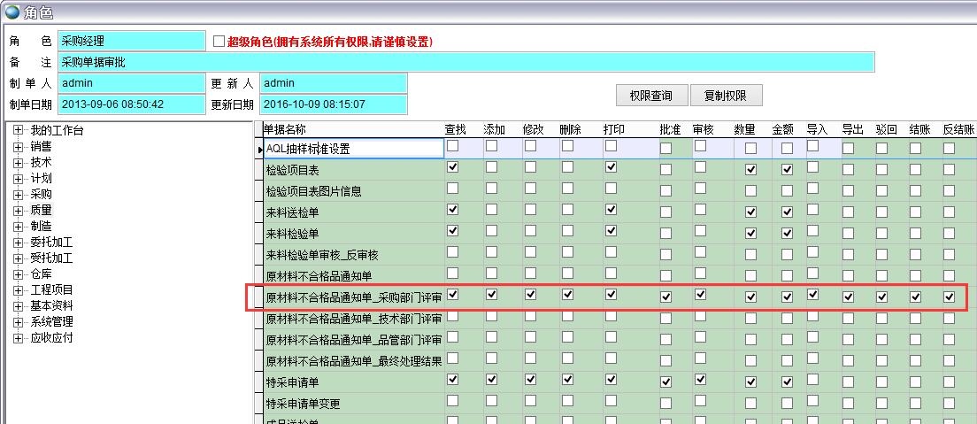 原材料不合格品通知單生成后需要經過相關部門的評審,在權限設置中為相關部門開通單據的權限。
