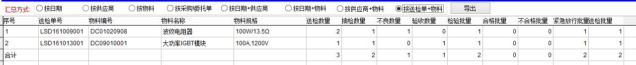 匯總方式 按日期匯總 按供應商匯總 按物料匯總 按采購單匯總 按日期+供應商匯總 按日期+物料匯總 按供應商+物料匯總 按送檢單+物料匯總 導出 可以將上面的明細導出到excel 也可以將下面的匯總導出到excel