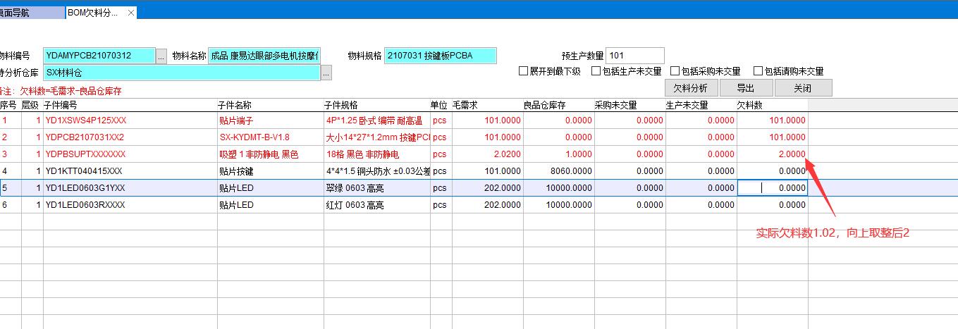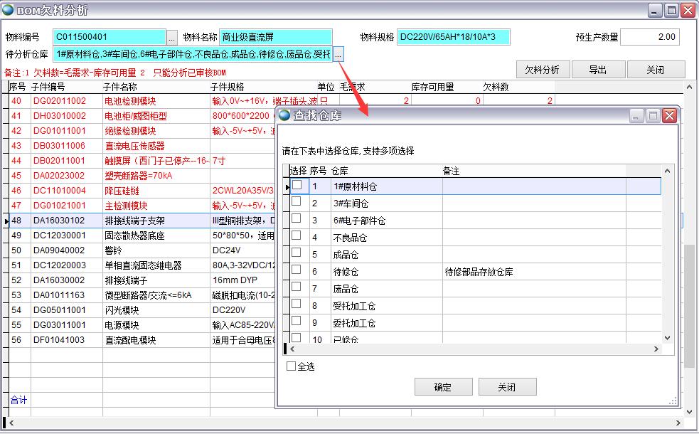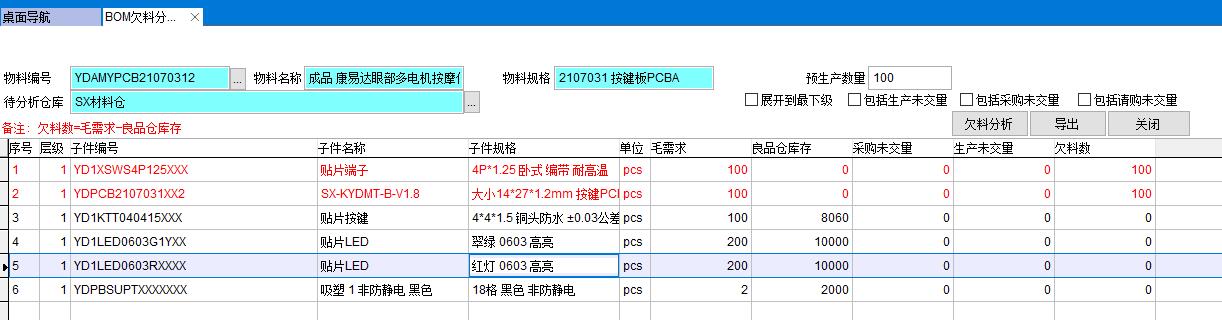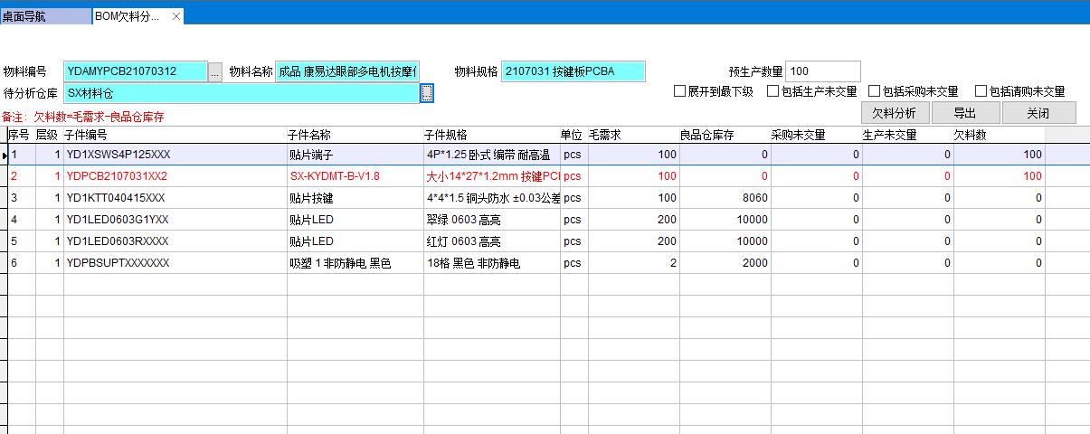 BOM欠料分析與MRP計算都是對物料需求進行分析,與MRP計算不同的是BOM欠料分析功能簡單計算速度快,只對現有庫存進行欠料分析。