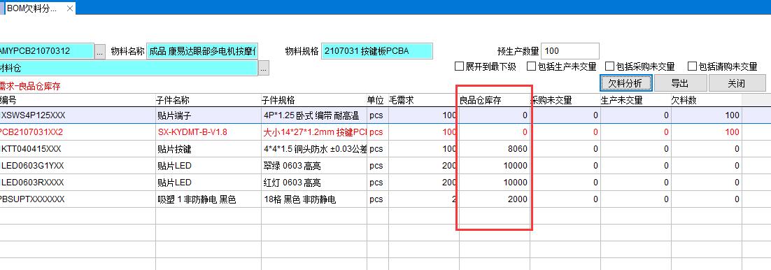 某訂單需要緊急生產,此時該訂單優先級別最高,所有物料庫存都參與計算,用BOM欠料分析看能否滿足物料需求