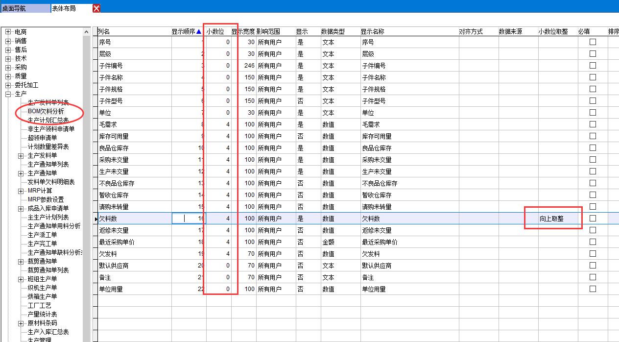 表體布局中設置小數位