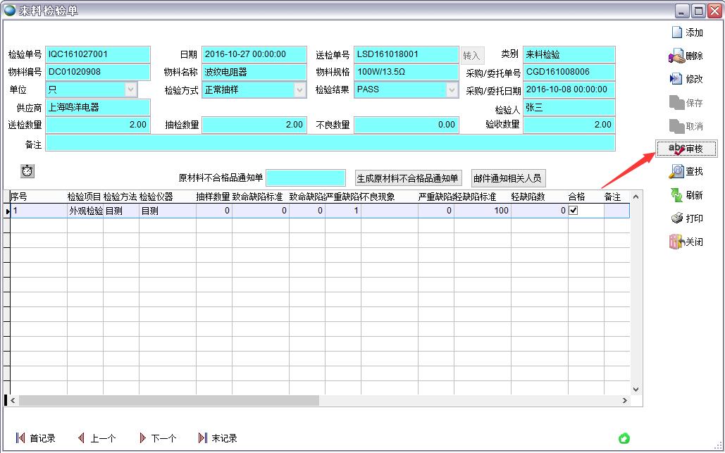 來料檢驗單也可以單個進行審核