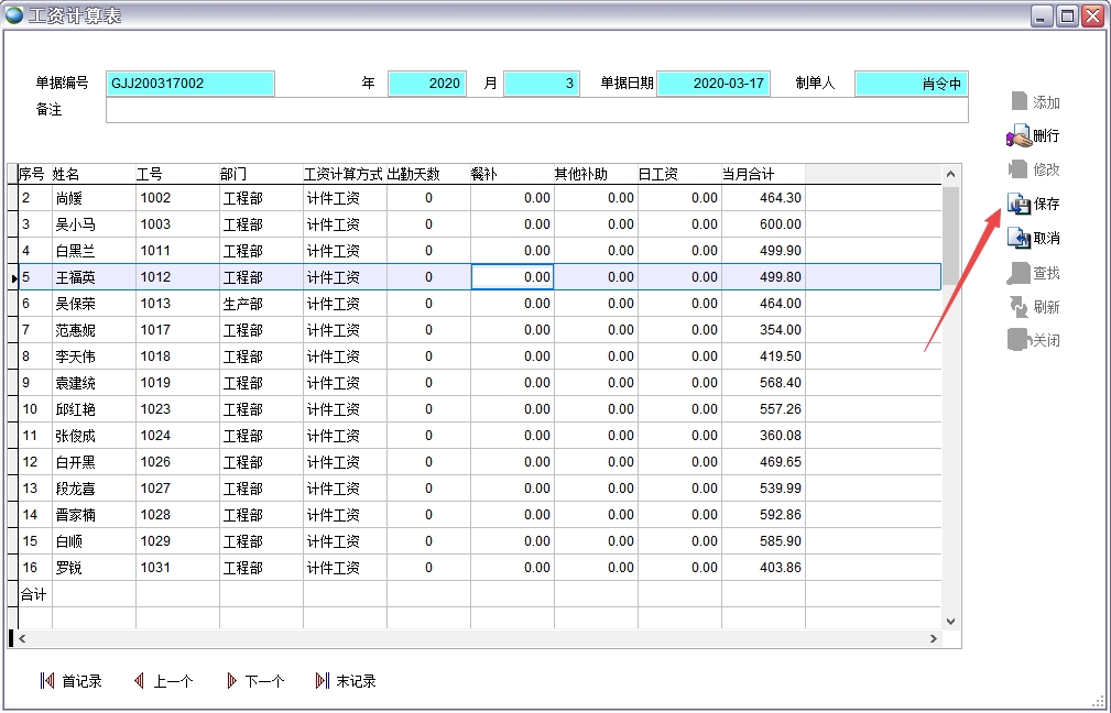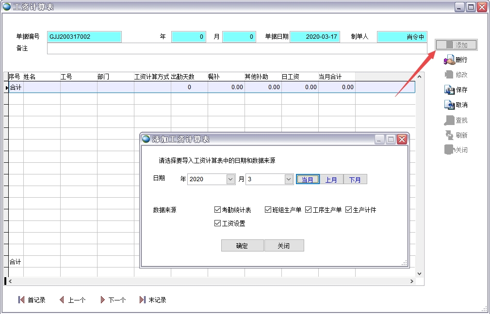 新建工資計算表 上述數據都準備好后就可以做工資表。 1、添加 2、選擇年月、需要導入的單據 3、保存 4、導入后可以手工修改數據,如果日薪員工有考勤記錄則日薪人員工資根據考勤天數和日工資計算得出?记谟涗泴υ滦絾T工無效,月薪員工的工資直接從工資設置中導入。