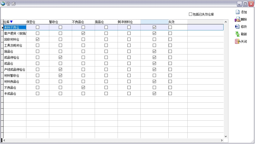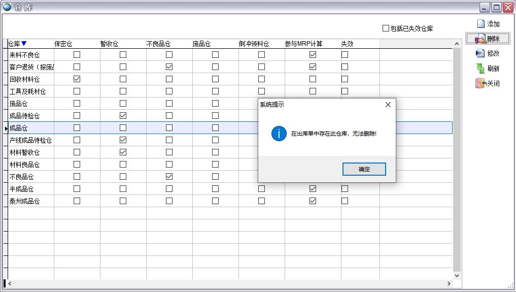 如果倉庫不再使用有無法刪除的,可以勾選失效屬性。