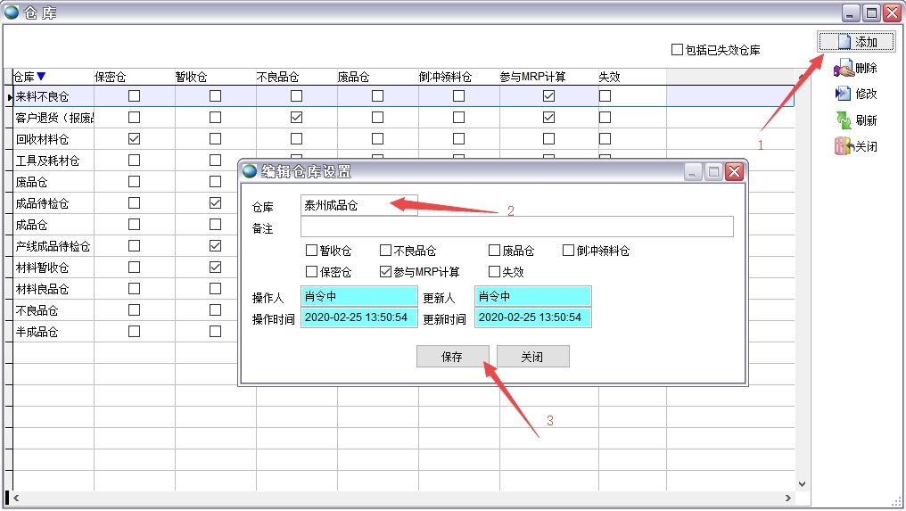 3、選擇倉庫屬性,包括暫時倉、不良品倉、廢品倉、倒沖領(lǐng)料倉、保密倉、失效、參與MRP計算