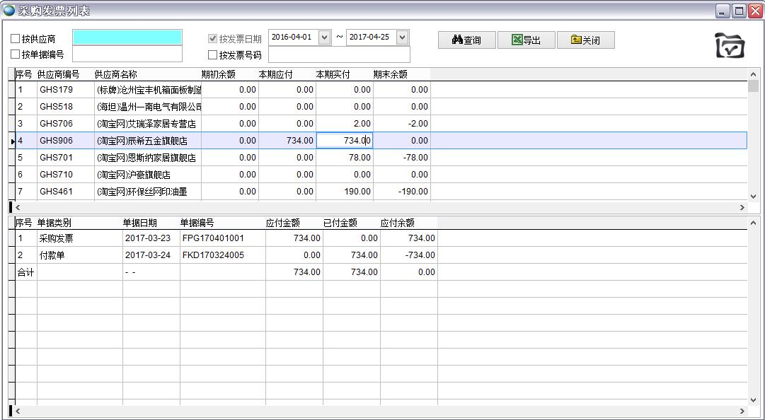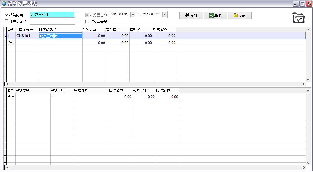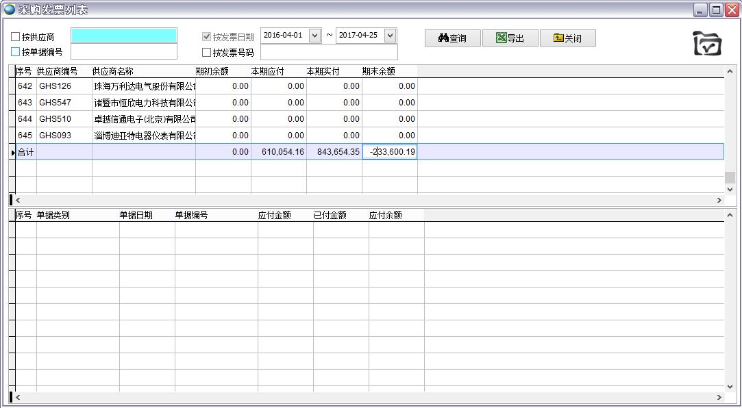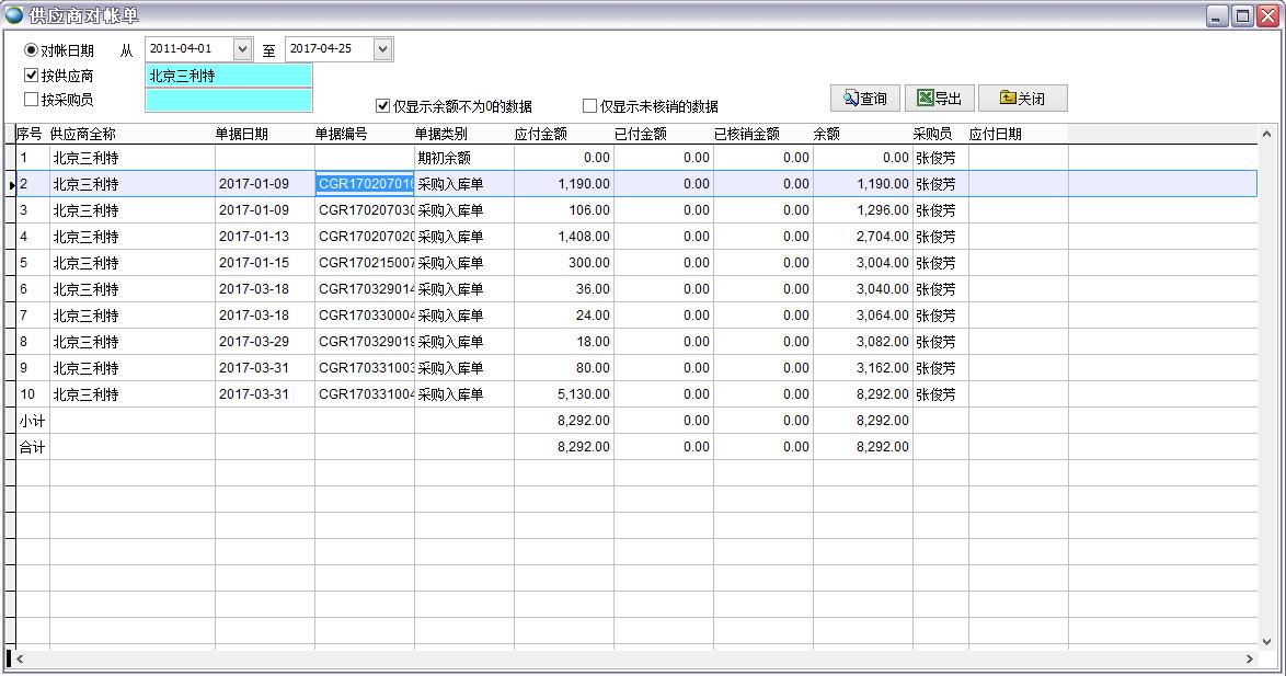 期初余額和期末余額為正表示我方欠供應商貨款,負數表示我方預付供應商貨款 下圖合計中的期末余額表示到2017年4月25日,總共供應商欠我方貨款金額-233600.19元 在供應商對帳單中也可以看到總的欠款金額。 與供應商對帳單不同的是采購發票列表只統計含稅的情況,如下圖,如果采購單是不含稅的,在采購發票中無法顯示但在供應商對帳單中有顯示 因此采購發票列表只能反應所有含稅的供應商欠款情況。 單據類別 單據類別包括應付期初余額、采購發票、付款單,分別對應的單據是應付期初余額、采購發票、采購付款單