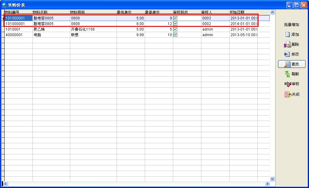 第三步,對采購的物料規定采購價格?梢詫ν粋物料在不同時間段規定不同價格。