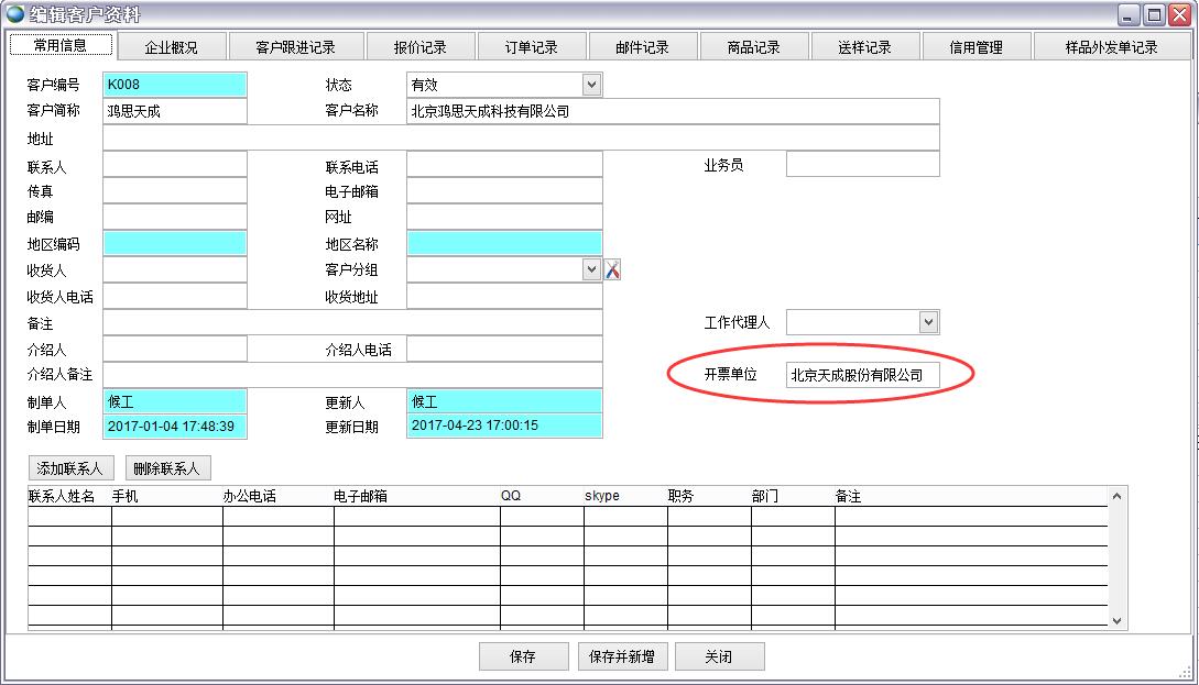 默認的客戶名稱就是開票單位,即發票上的買方名稱。如果發票上購買方名稱不是ERP中的客戶名稱,可以在客戶資料表中填寫開票單位