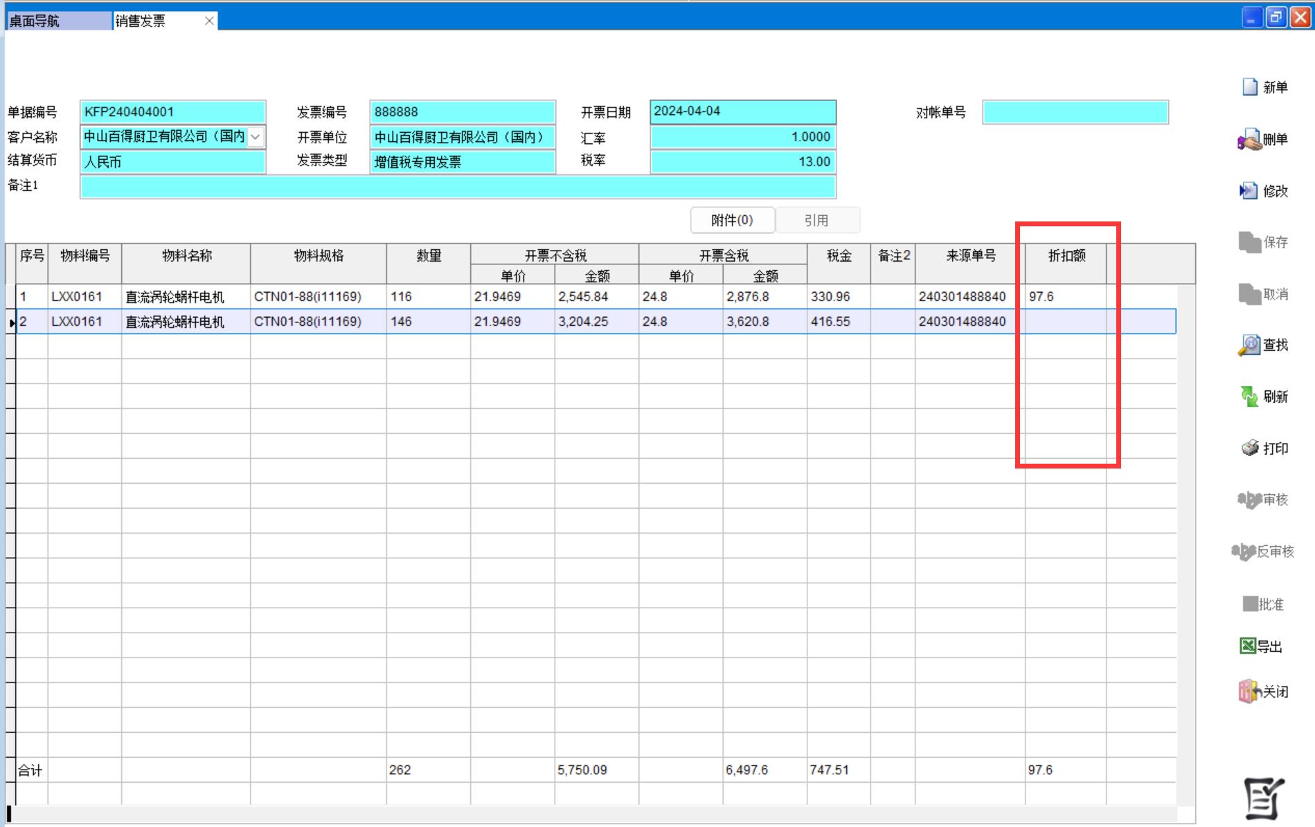 默認是不顯示折扣額的,可以使用表體布局顯示出來