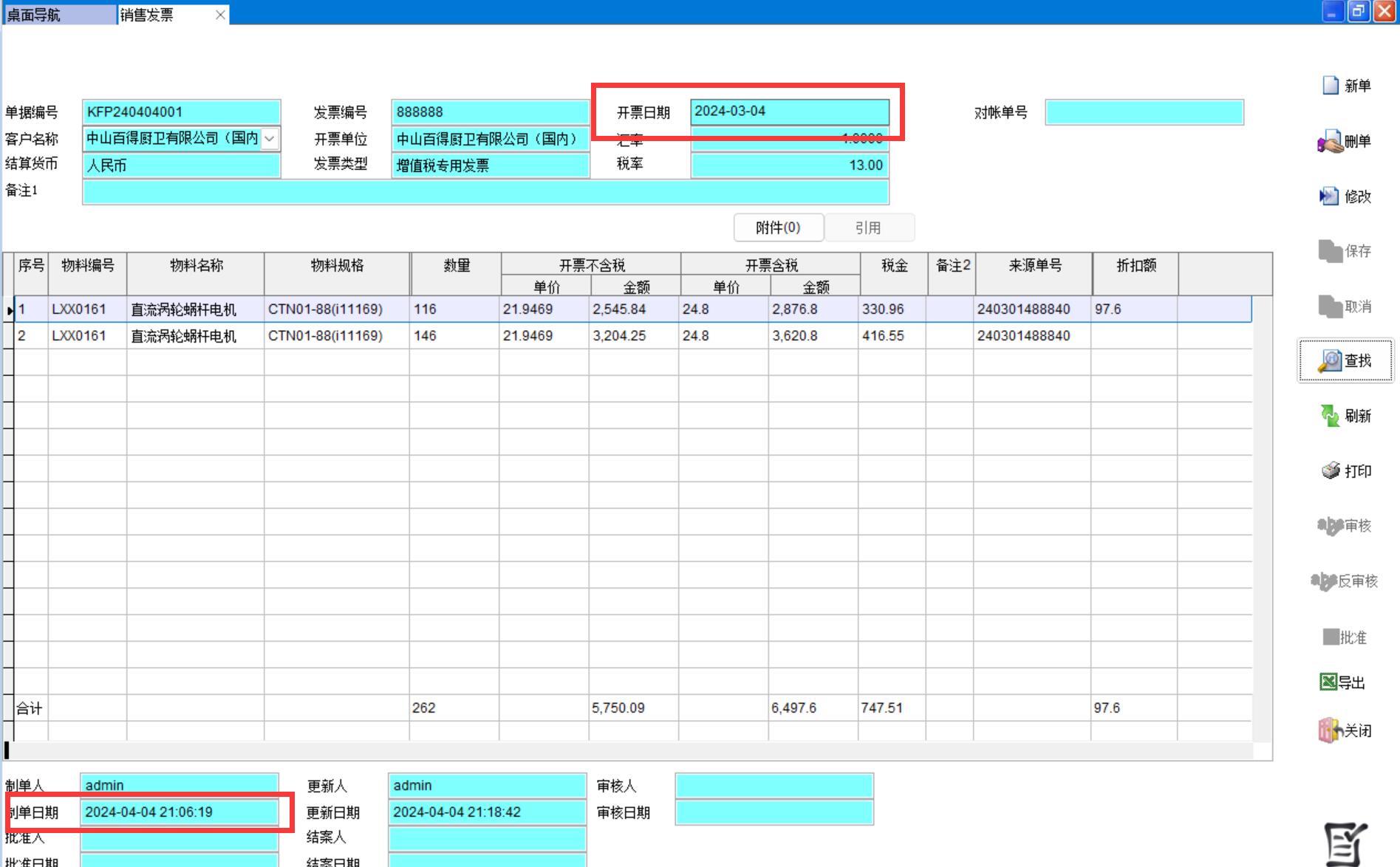 如下圖,4月4號做了一張發票,補3月份的發票,制單日期不能修改,開票日期改成3月份的發生日期。這張發票就算是3月份的發票。