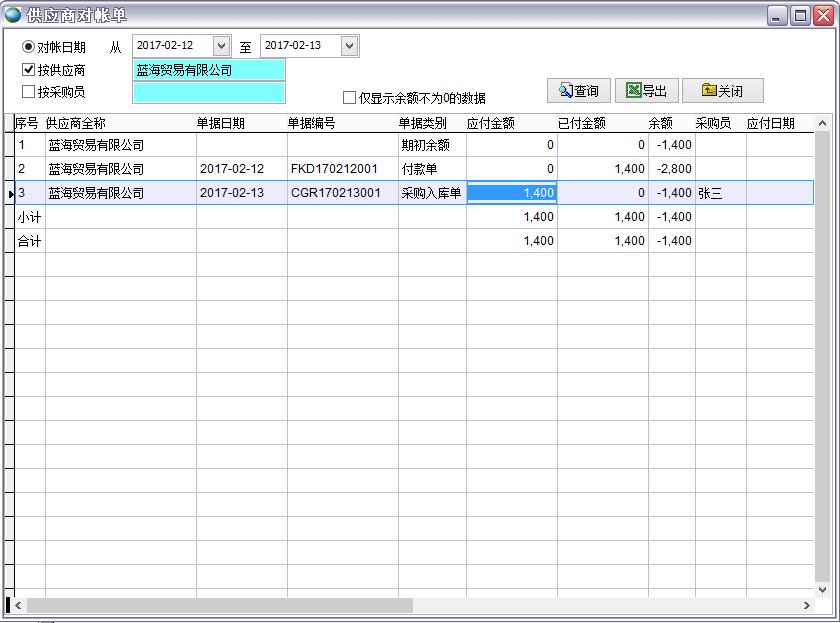 不勾選僅顯示余額不為0的數據時,會將所有供應商顯示出來。但是勾選此選項后不顯示的供應商不表示這時間段沒有業務發生