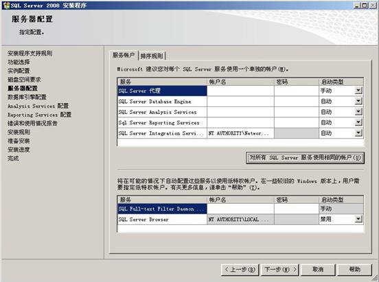 27.服務器配置主要是服務啟動帳戶的配置,服務的帳戶名推薦使用SYSTEM的系統帳戶,并指定當前選擇服務的啟動類型,點擊“對所有SQL Server服務使用相同的帳戶”,如下圖所示: