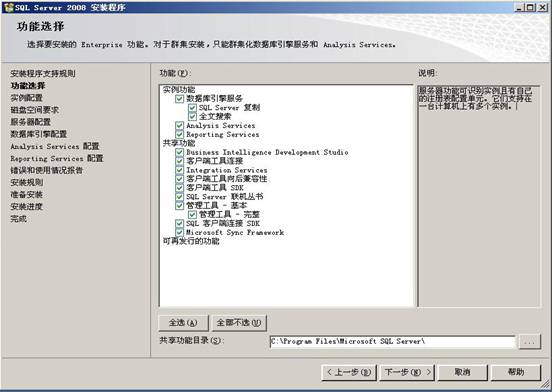 24.選擇需要安裝的功能項,在這里我們選擇“全選”,共享功能目錄默認即可,點擊【下一步】,如下圖所示:
