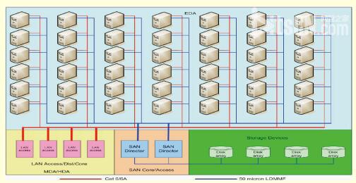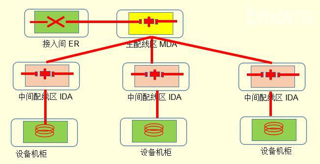 傳統數據中心采用分布式的管理方式,列頭柜集中放置接入交換機和水平配線架,用來統一管理一列的設備。云計算的數據中心采用集中管理方式,所有的設備機柜采用光纖上連到主配線區(MDA)/中間配線區(IDA),在主配線區(MDA)/中間配線區(IDA)內集中放置光纖配線機架(ODF)和分支(Spine)交換機。這種集中管理方式有利于統一管理,可以提高交換機設備端口使用率,另外可以減少管理員足跡。