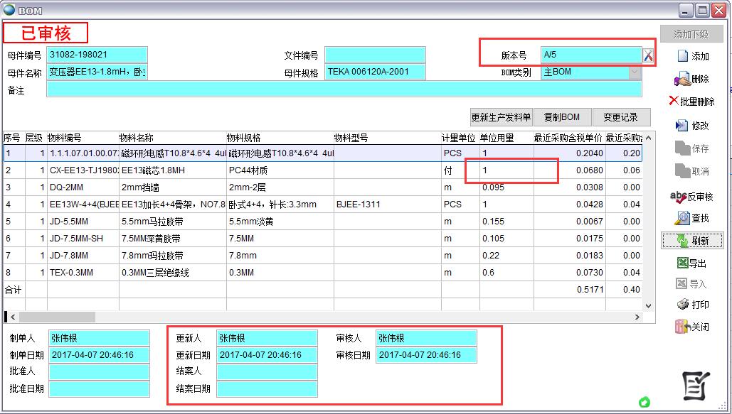 3、如果BOM為審核狀態則審核人、審核日期發生變化