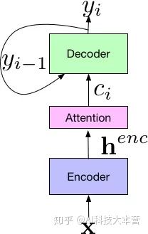Sequence-to-Sequence 方法原來主要應用于機器翻譯領域。2017 年,Google 將其應用于語音識別領域,取得了非常好的效果,將詞錯誤率降低至5.6%。如下圖所示,Google 提出新系統的框架由三個部分組成:Encoder 編碼器組件,它和標準的聲學模型相似,輸入的是語音信號的時頻特征;經過一系列神經網絡,映射成高級特征 henc,然后傳遞給 Attention 組件,其使用 henc 特征學習輸入 x 和預測子單元之間的對齊方式,子單元可以是一個音素或一個字。最后,attention 模塊的輸出傳遞給 Decoder,生成一系列假設詞的概率分布,類似于傳統的語言模型。