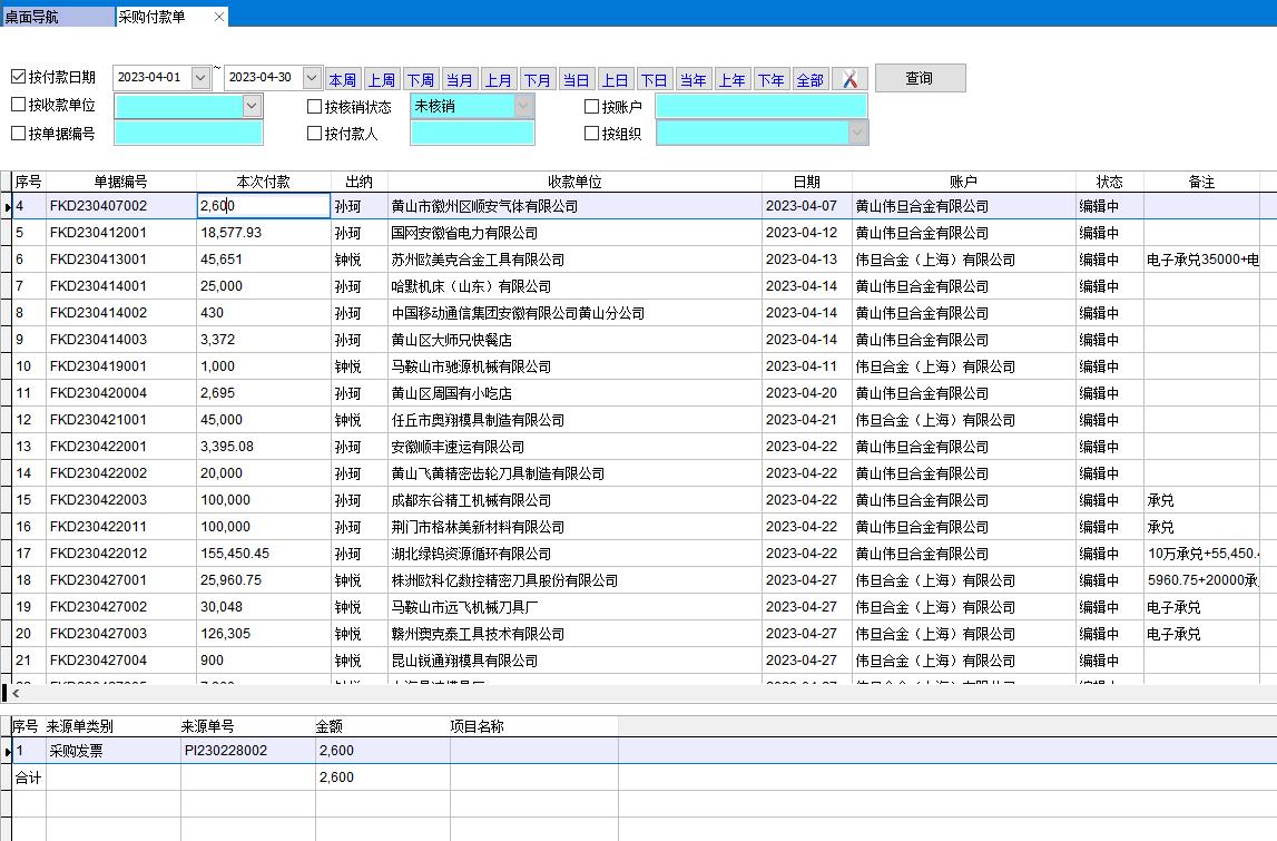 上ERP系統的一個好處就是你不用擔心漏付或重復付款,ERP系統會自動幫你記住還有多少沒付。
