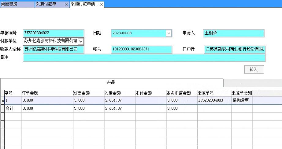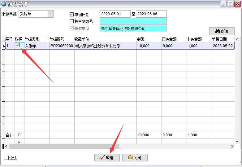 這張采購單之前已經付過9000元,因此本次可轉金額為1000元