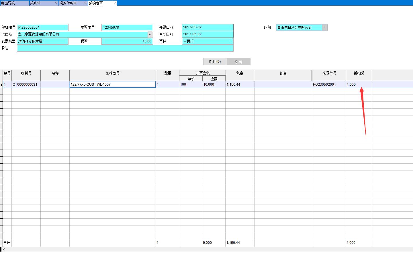 假設采購訂單1萬,到貨金額也是1萬,現在供應商給予10%折扣,開票金額還是1萬,折扣1000元,最后只要付0.9萬
