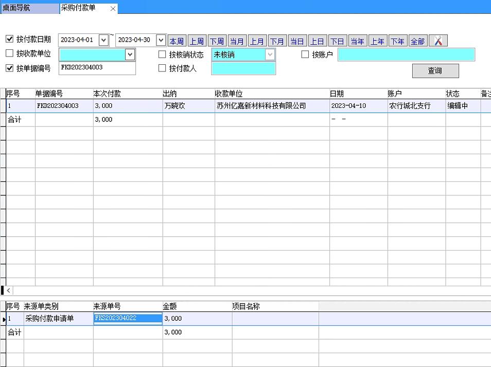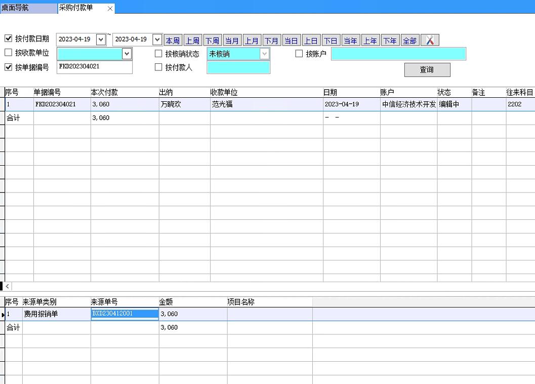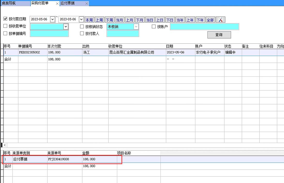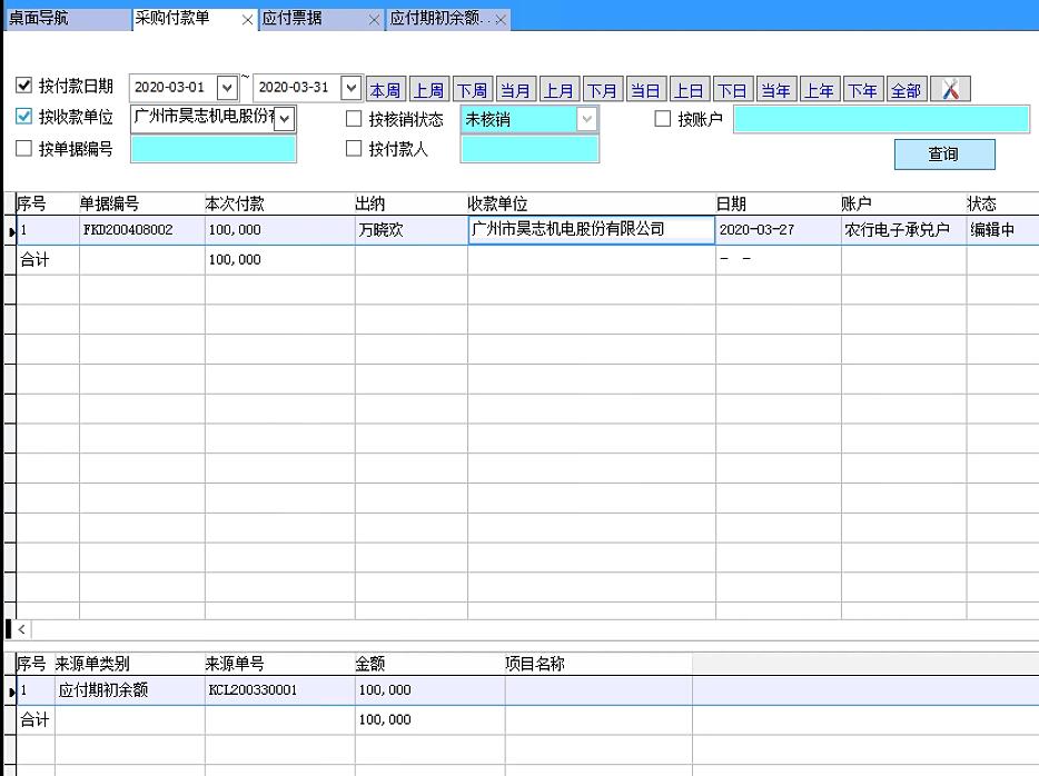 打開路徑:【主菜單】-【應收應付】-【應付】-【采購付款單】