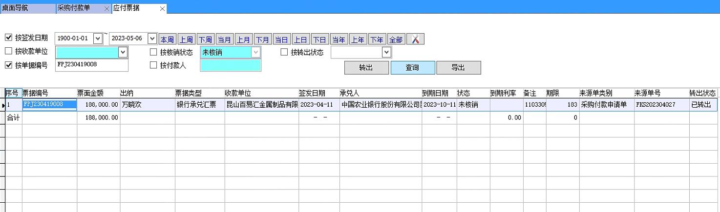假設我方給供應商開具一張承兌匯票先做到期要從帳戶付款,在應收票據中點轉出即可生成采購付款單