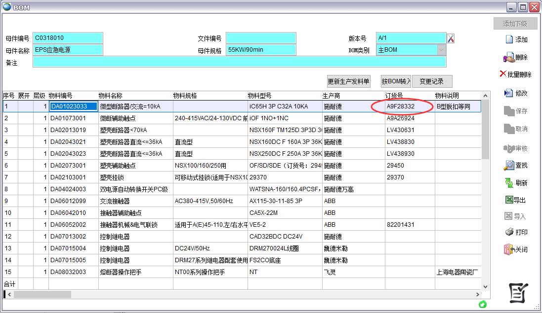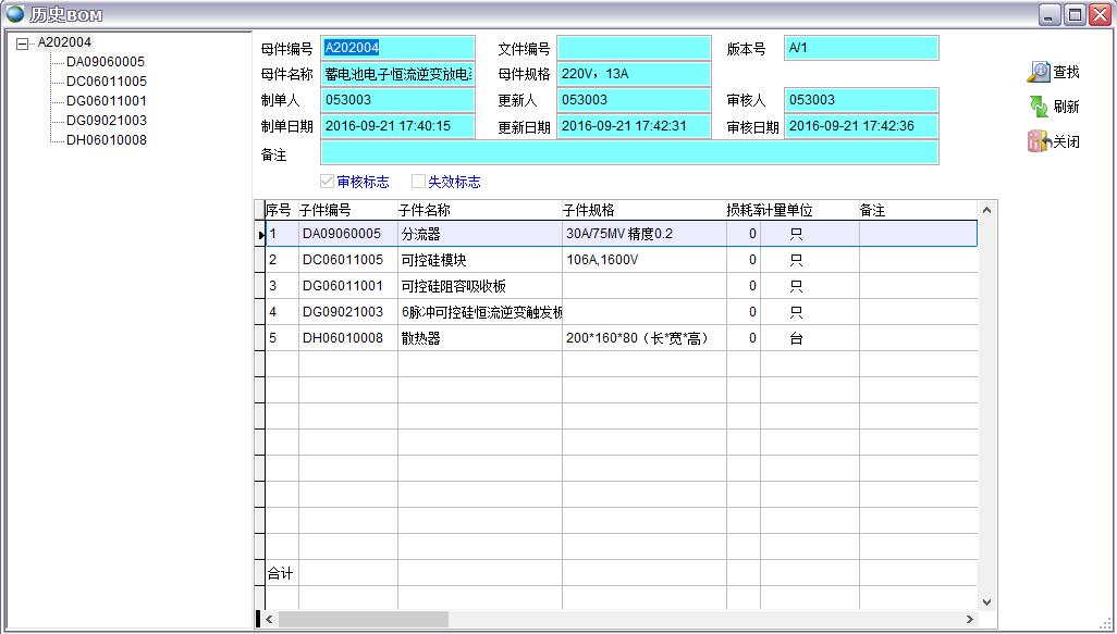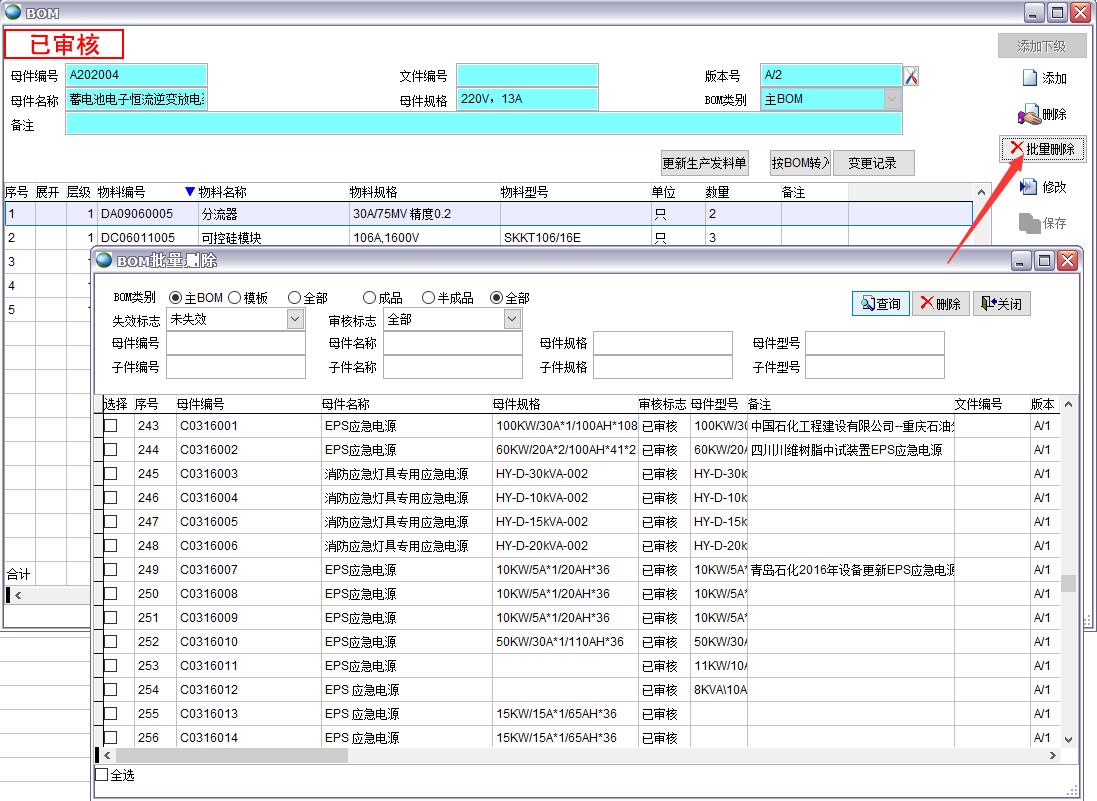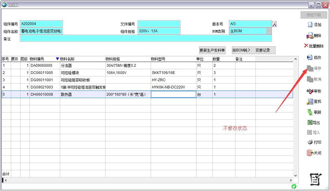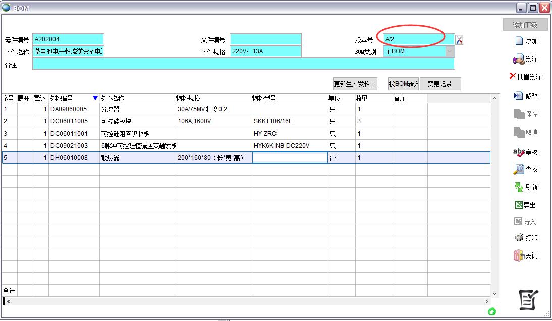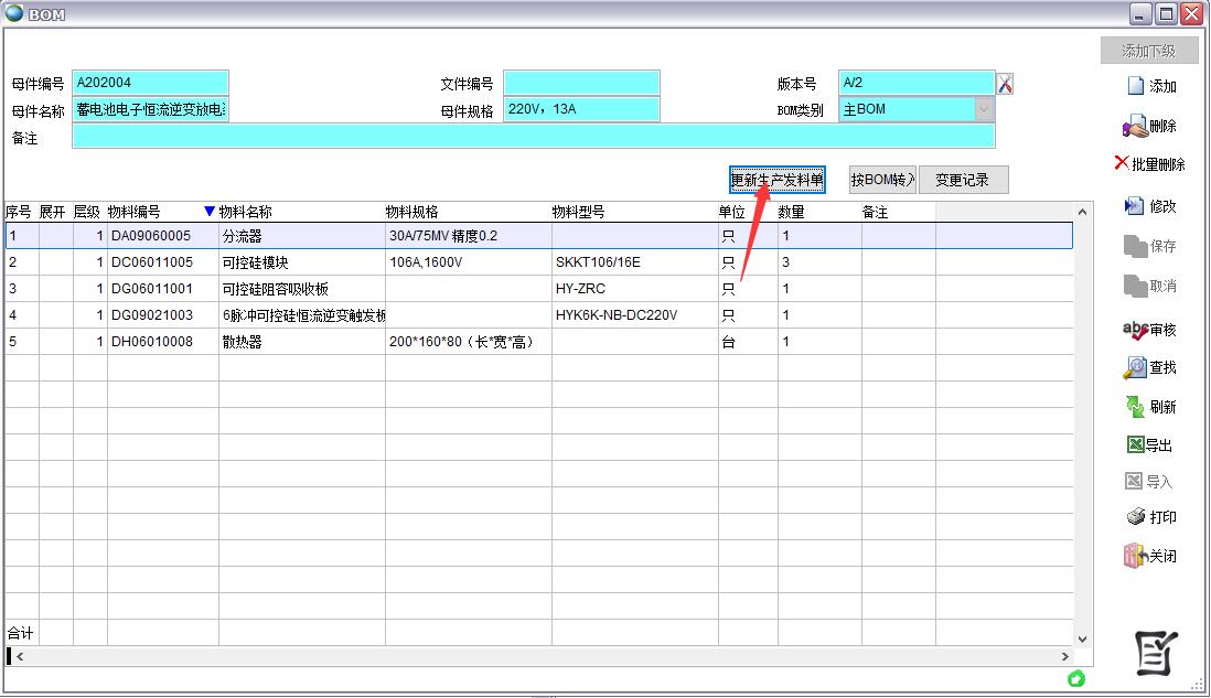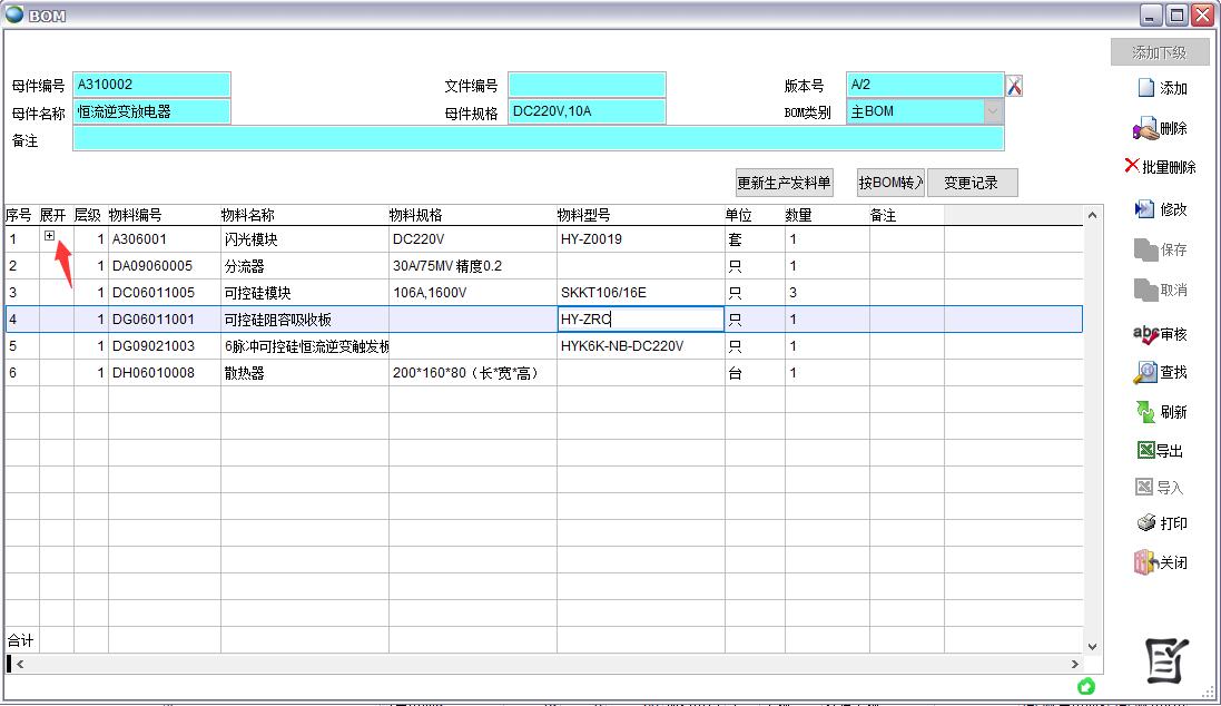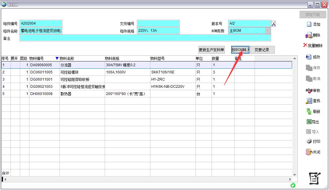 母件編號是指組成這個BOM的產(chǎn)成品,以上圖為例就是蓄電池電子恒流逆變放電裝置。