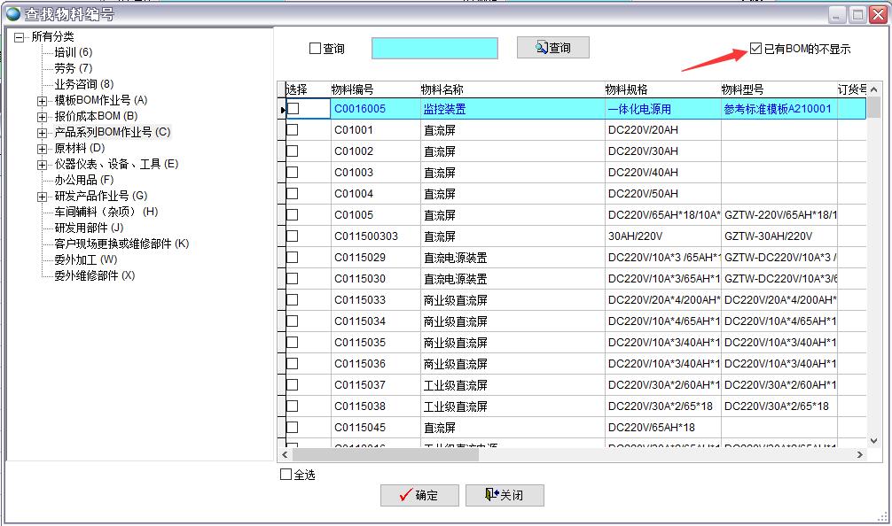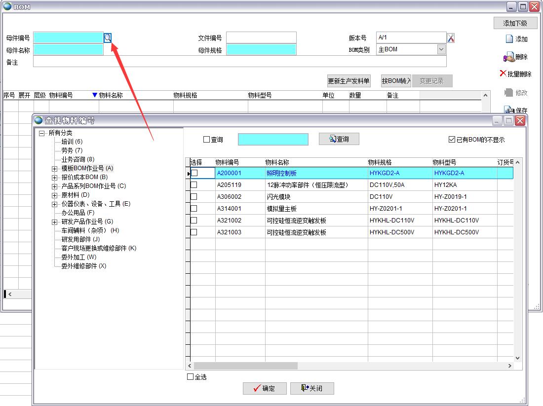 4、在查找物料編號中選擇一個物料編號,如果是一個新的BOM可以勾選已有BOM的不顯示