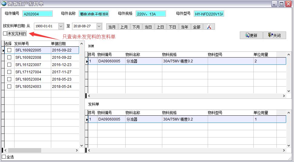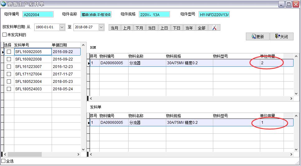 點更新生產(chǎn)發(fā)料單可以更新有存在該BOM的所有發(fā)料單,在更新生產(chǎn)發(fā)料單界面中可以看到物料數(shù)量變更的情況,對還未執(zhí)行完的發(fā)料單可以進行變更。