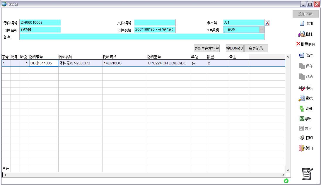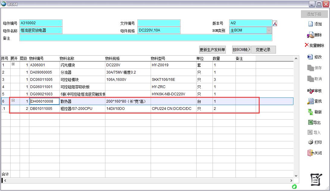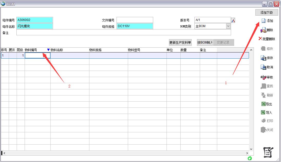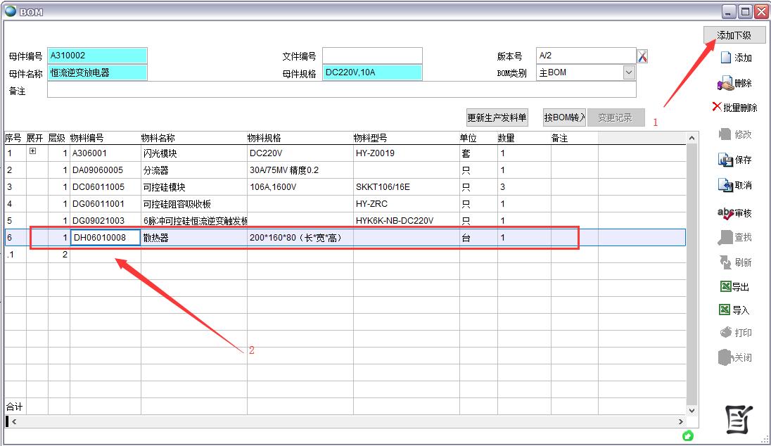 添加下級按鈕是添加選中物料的下級物料,如下圖,選中一行記錄點添加下級,此時會添加編號DH06010008的下級物料,如果該物料沒有BOM,添加完后會自動生成BOM