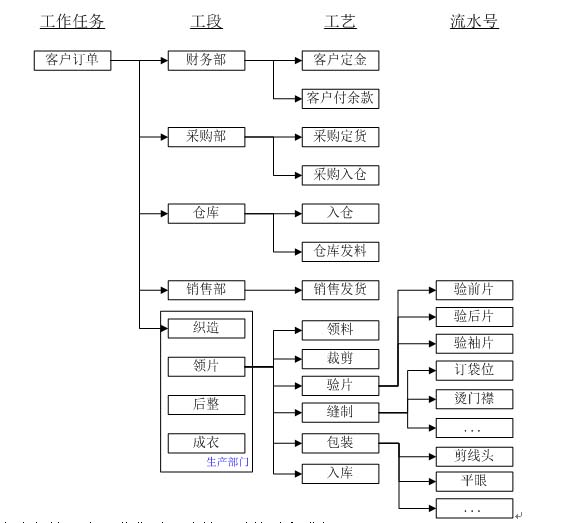 一般地,本系統(tǒng)粗略管理和精細管理就是為了使系統(tǒng)靈活操作,用戶在使用時可以根據(jù)自身的情況,或者某個時期的特殊需要,自定義上述流程的各個工序及流水號。如果用戶想對本工序進行詳細管理甚至日報表、現(xiàn)場生產(chǎn)數(shù)量,就可以采用精細管理;而如果某個工序中用戶不太感興趣或目前該工序參與力度不深,就可以采用粗略管理來控制,同時,本系統(tǒng)又認為:精細管理中工序級的管理者(如織造組長、成衣組長等),可以對工序級數(shù)量或報表進行控制,而現(xiàn)場院生產(chǎn)數(shù)量(如某流水號生產(chǎn)記錄表)現(xiàn)場生產(chǎn)員工也可以進行錄入和控制。