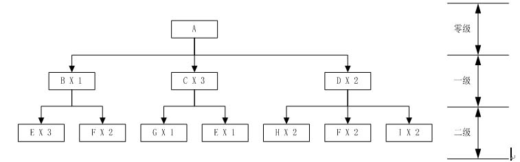 下圖是一個3級的BOM結構,表示產品A由1個B部件、3個C部件、2個D部件組成,其他部件依次類推。A是零級,也就是在這個BOM中是成品,而B、C、D是一級BOM,其它的組成三級,在級的結構中,可以存在嵌套,也即,某個部件,既可以在二級出現,也可以在三級中出現。這是一個通用例子。實際上,**企業的BOM大多是二級或三級結構。也基本上不存在嵌套的情況。