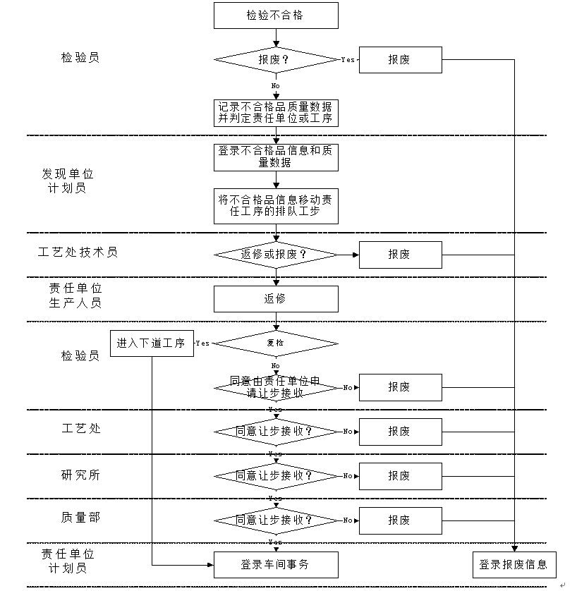 3. 對返修后的產品進行復檢,合格的填寫產品合格單,由分廠計劃員登錄《加工任務單》的執行結果;需要報廢的判定報廢,由分廠計劃員登錄報廢信息;認為可以申請讓步接收的,同意責任單位申請辦理讓步接收;